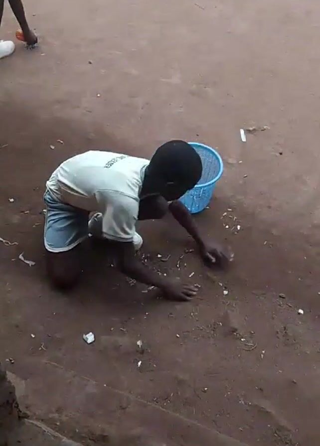 A young boy is kneeling on the ground, picking up litter and placing it in a small, light blue wastebasket beside him. The ground is brown dirt, and some small white pieces of trash are scattered around. The boy is wearing a white t-shirt, gray shorts, and white sneakers. The video is filmed from a slightly elevated position, looking down at the scene.