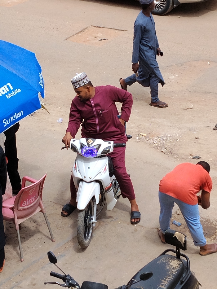 The scene is set on an unpaved, dusty thoroughfare in Fagge A, Nigeria. A male subject is positioned astride a white scooter-style motorcycle, facing slightly left. He wears a maroon traditional tunic and trousers, a white and black patterned cap, and dark slip-on sandals. A pen is visible in his tunic pocket, and his left hand is in his pocket. The motorcycle's headlight emits a distinct purple-blue glow. In the mid-ground, a second male subject walks from right to left, wearing a blue-grey traditional tunic and trousers and a dark cap, with brown sandals. His left hand holds a dark rectangular object. To the right, a third male subject, wearing an orange t-shirt, light blue trousers, and light brown sandals, is bent over, interacting with the ground. On the far left, a blue umbrella displaying "Sunelan Mobile" text is partially visible, alongside a light pink plastic chair featuring an "airtel" logo. The ground shows scattered debris, including small pieces of paper and a discarded corn cob. In the immediate foreground, the handlebars and a portion of the seat of a dark motorcycle are visible.
