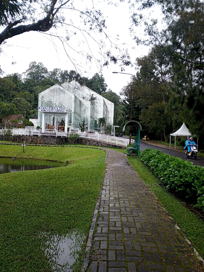 A glass conservatory labeled "Konservatori Kebun Raya Cibodas" sits behind a white fence, overlooking a pond and manicured lawn