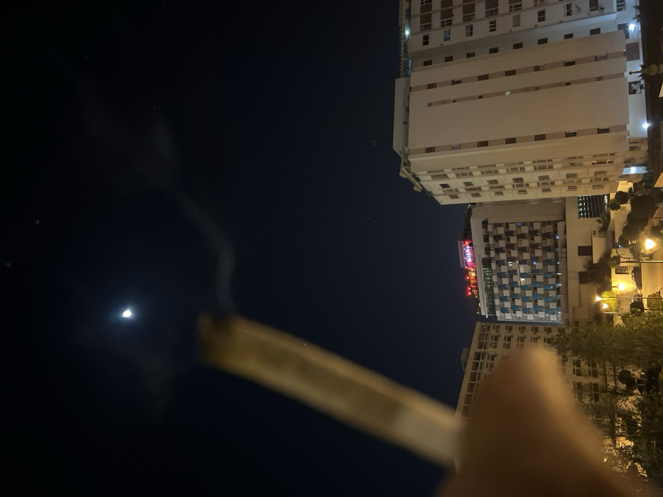 An angled shot at night shows a lit cigarette in the foreground, smoke curling upwards. A crescent moon is visible in the dark sky, along with a few stars. Buildings, including what appears to be a hotel with lit windows and signs, are on the right side of the frame. Street lights illuminate trees and foliage nearby, contributing to the overall urban night scene.