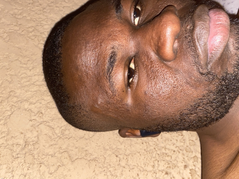 A close-up photographic portrait depicts an adult male in Udu, Nigeria. The subject exhibits dark skin, short dark hair with a faded cut, and a short, dark beard. A notable raised scar is present on his left temple. A dark earbud is inserted into his left ear. His gaze is directed forward. The background is a textured wall of a light brown or beige hue. Illumination appears dim.