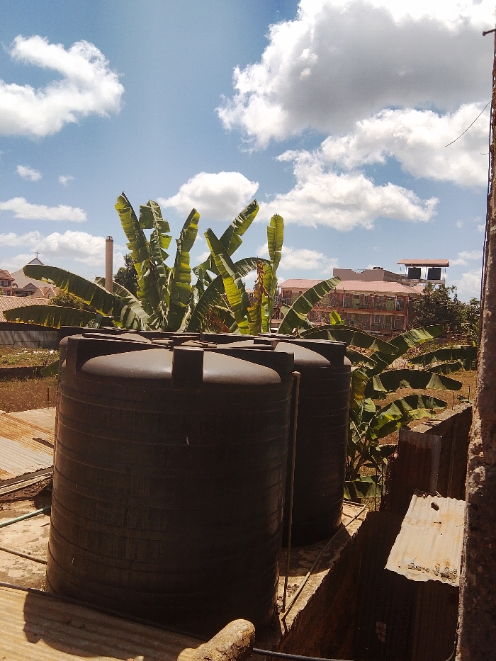 The image displays an outdoor scene in Karingani ward, Kenya, captured under a bright blue sky with scattered white cumulus clouds. In the immediate foreground, two dark-colored, ribbed cylindrical plastic water storage tanks are prominently featured, situated on a flat surface above what appears to be corrugated metal roofing. White piping is visible connecting to the tanks. To the right, a rough concrete wall edge borders a structure partially constructed from corrugated metal sheets. A rough wooden log or beam lies across the lower center foreground. A dark, textured vertical structure frames the far right edge of the image. The midground is dominated by several large, vibrant green banana plants, their leaves extending upwards behind and above the water tanks. Beyond these plants, an expanse of dry, light brown ground is visible. The background reveals a residential or urban area characterized by multiple buildings featuring reddish-brown tiled roofs. Distinct structures include a building on the left with a dark, possibly ecclesiastical, rooftop fixture, a tall, slender chimney-like stack, and multi-story buildings with balconies, one of which possesses a smaller, elevated structure on its roof. No individuals, discernible actions, or interactions are present in the scene.