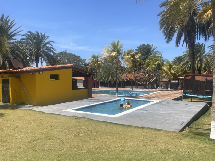 The image depicts an outdoor recreational area in San Juan Bautista, Venezuela, under a clear blue sky. In the foreground, a manicured green lawn occupies the lower left. A bright yellow, single-story building with a reddish-brown tiled roof is situated on the left, featuring a dark brown wooden door on its left facade and a small rectangular window opening on the front. Two slender poles or ladders lean against the building's left side. White exterior lighting fixtures are mounted under the eaves. To the right of the yellow building, two rectangular swimming pools are visible. The closer pool contains two individuals, appearing to be children, partially submerged; one is utilizing a yellow inflatable ring. This pool is bordered by dark gray concrete paving. Further back, a larger rectangular pool is surrounded by reddish-brown paving. A single individual is discernible walking on this paving between the two pools, moving towards the left of the frame. Numerous palm trees, varying in height and type, are densely distributed throughout the scene, particularly in the background and along the right side. Additional structures with reddish-brown tiled roofs are visible behind the larger pool and trees. On the right side of the image, adjacent to the larger pool, a trampoline with a dark netting enclosure stands on a blue base. The scene is brightly lit by natural sunlight, indicating daytime conditions.