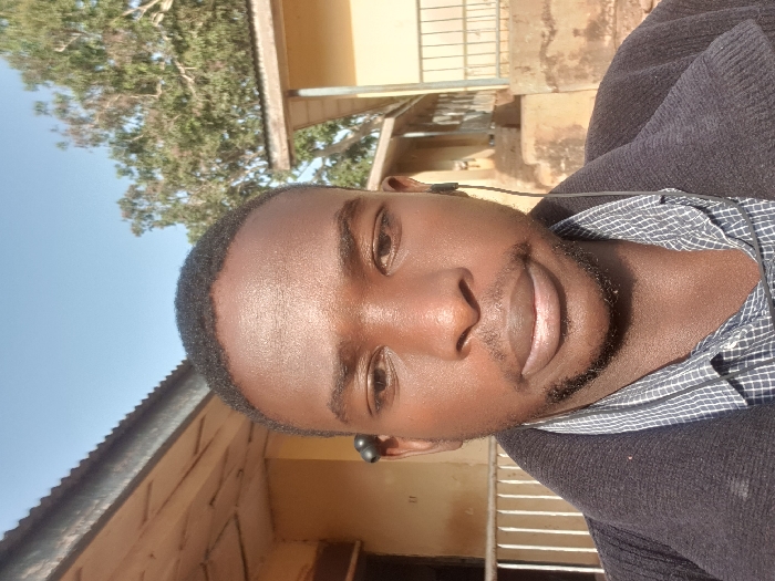 A Black male subject, appearing to be a young adult, is depicted in a close-up, chest-up outdoor portrait
