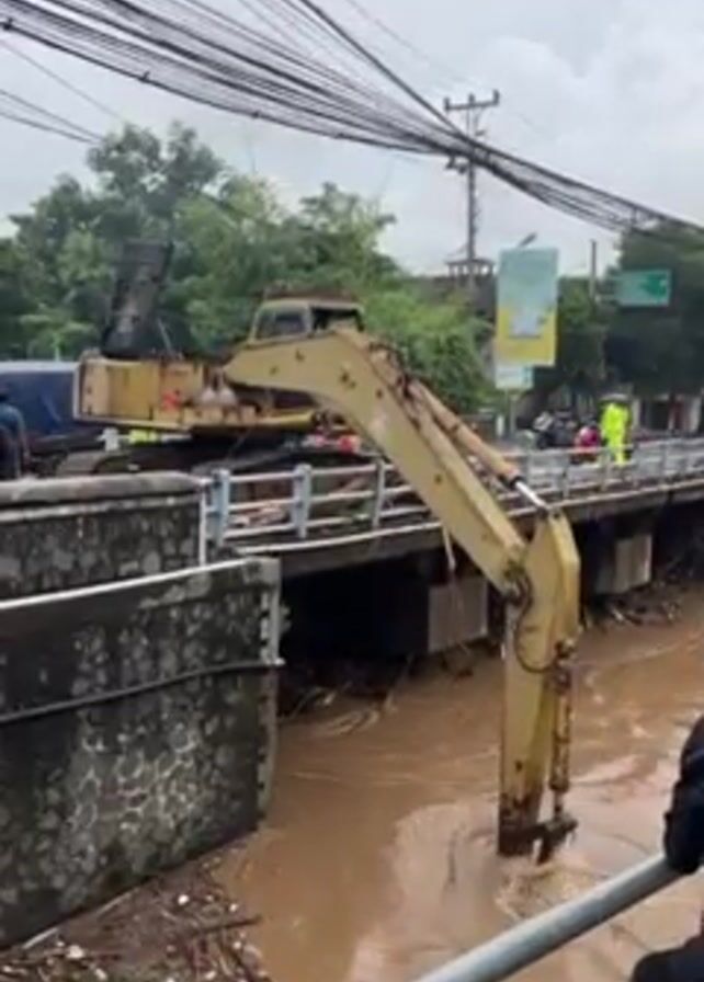 n excavator on a bridge, using its shovel to clear debris from a river with muddy water. The excavator is yellow and appears somewhat worn. The bridge is made of concrete and has metal railings. The river is full of debris, including tree branches and other organic material. The water is flowing rapidly. In the background, there is a road with traffic, trees, power lines and a cloudy sky. Some people are visible on the bridge, including individuals wearing high-visibility vests. The video seems to be recorded from a moving vehicle. The scene indicates flooding and efforts to clear the waterway.
