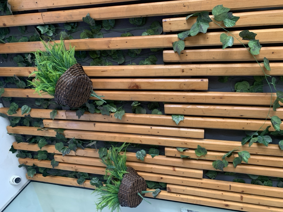The image displays a decorative wall feature, likely situated in Alagbede, Nigeria. The primary components consist of numerous vertically oriented, light-brown wooden planks of varying lengths and widths, affixed to a dark background. Artificial green ivy-like vines are draped and interwoven among these wooden planks. Two dark brown, woven wicker-style hanging baskets, each containing artificial green fern-like plants, are mounted on the wooden structure. A single white CCTV camera is visible in the upper left corner, mounted against a light-colored surface. No human subjects are present. The scene is static, featuring a combination of artificial botanical decor and a security surveillance device.
