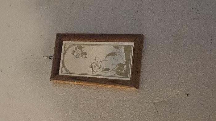 This scene is located in Lompoc, United States. A single, vertically oriented, rectangular picture frame crafted from dark brown wood with visible grain hangs against a light grey, textured wall. The picture is suspended by a small, curved metal hook protruding from the wall, which engages a similar metal eyelet positioned on the top center edge of the frame. The framed artwork is an etching or print, light-toned against a subtly textured, lighter background. It depicts a domestic cat, oriented in profile, seated upright and looking towards the upper right quadrant of the image. Above the cat, to its right, a butterfly or moth is depicted near a small cluster of foliage. The artwork's internal perimeter features an arched top section and a linear decorative border. The wall surface exhibits minor specks, dust particles, and subtle textural variations. No people are visible.