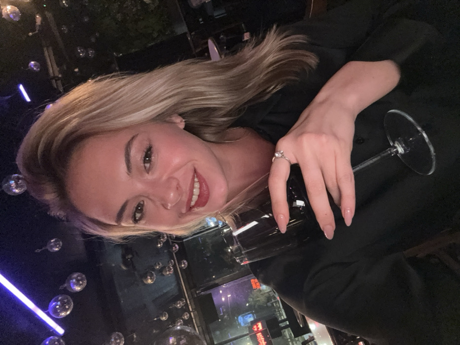 A blonde woman smiles while holding a wine glass. She is wearing a dark-colored top. A ring is visible on her left ring finger. The background shows a city night scene with scattered lights and decorations that appear to be disco balls. A neon purple light fixture is visible to the left. The woman's skin has a warm tone, and she has a bright smile.