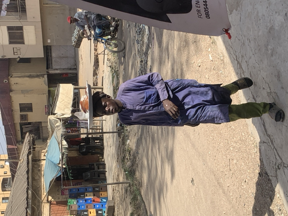 The image depicts an outdoor scene in Sabon Gari East, Nigeria, on a sunny day