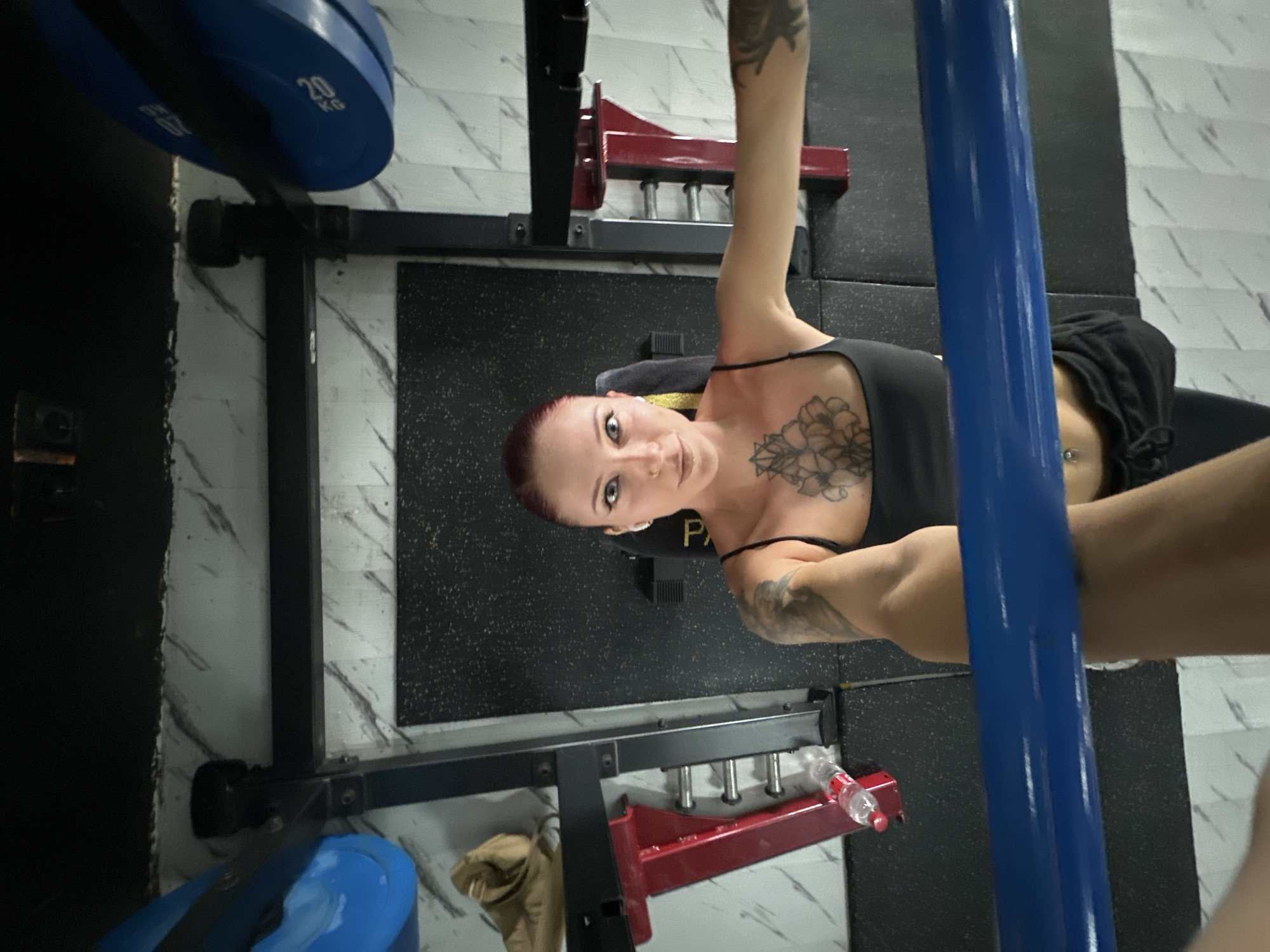 A woman with a flower tattoo on her chest is lying on a weight bench in a gym