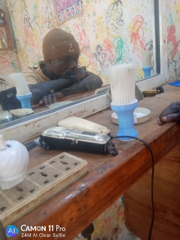 Interior of a barber shop in Unknown, Unknown. The scene features a dark-skinned individual reflected in a mirror, wearing a brown knit beanie and a light-colored shirt. This person is leaning forward with arms resting on a wooden countertop, observing the scene. The wall behind the reflection displays a multicolored, paint-splatter pattern in yellow, green, red, and black. Above the mirror, a framed picture contains several small portrait photographs. On the wooden countertop in the foreground, a black hair clipper with a beige and silver top is present, connected by a black cord. A light blue-handled neck duster brush with white bristles stands upright, positioned next to a small, round white container. To the left, a beige multi-socket power strip is visible. A white, cylindrical dispenser is partially visible on the far left. A dark-skinned hand is partially visible on the right side of the countertop, indicating the presence of another individual. The individual in the reflection appears to be resting or waiting.