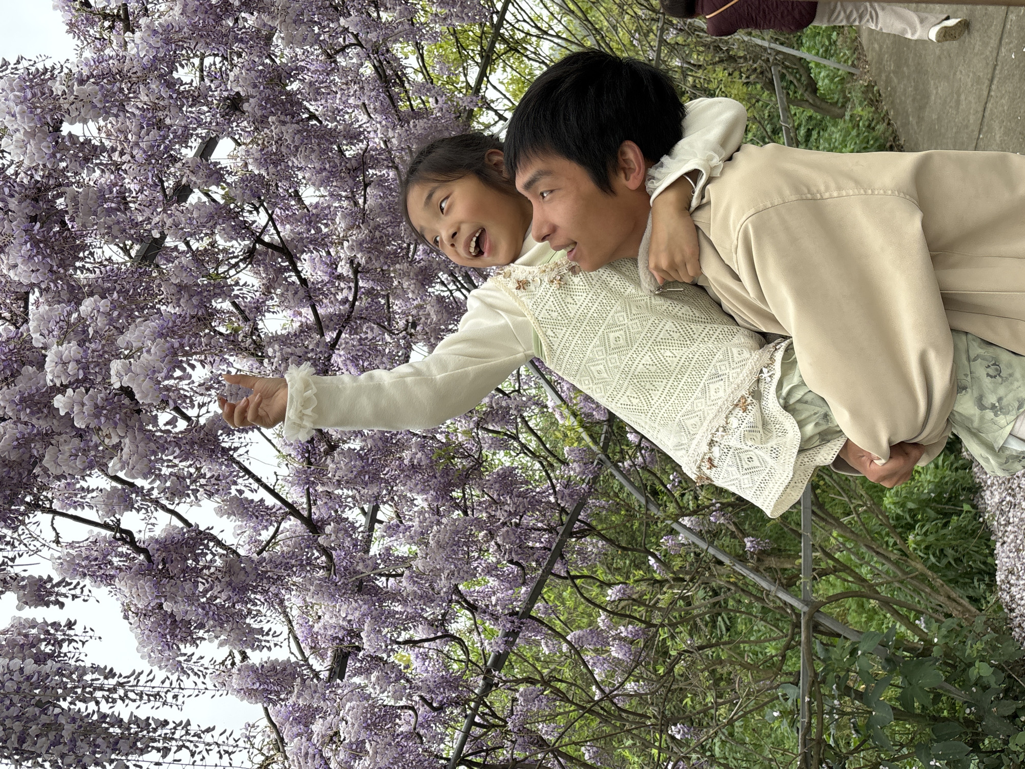 A photo depicts a man carrying a young girl on his back amidst a vibrant display of wisteria blooms