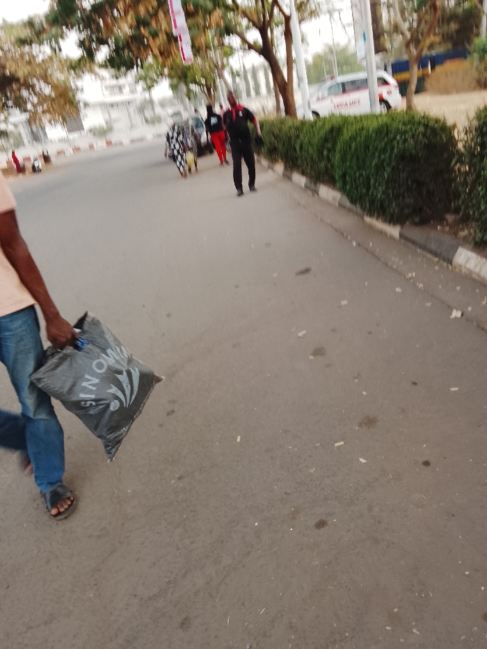 A street scene features several individuals. A man in jeans and sandals carries a black bag with "SINOW" printed on it. Further down the street, other pedestrians walk, including one in a patterned dress. A man in black walks ahead. A row of green bushes lines the roadside. An ambulance is parked in the background. The street is paved and appears to be littered with small debris.