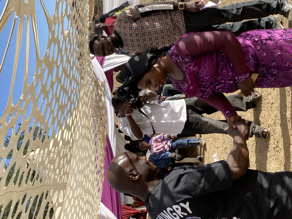 An outdoor event in Kuru Dungus, Nigeria, features a diverse group of individuals under a decorative canopy