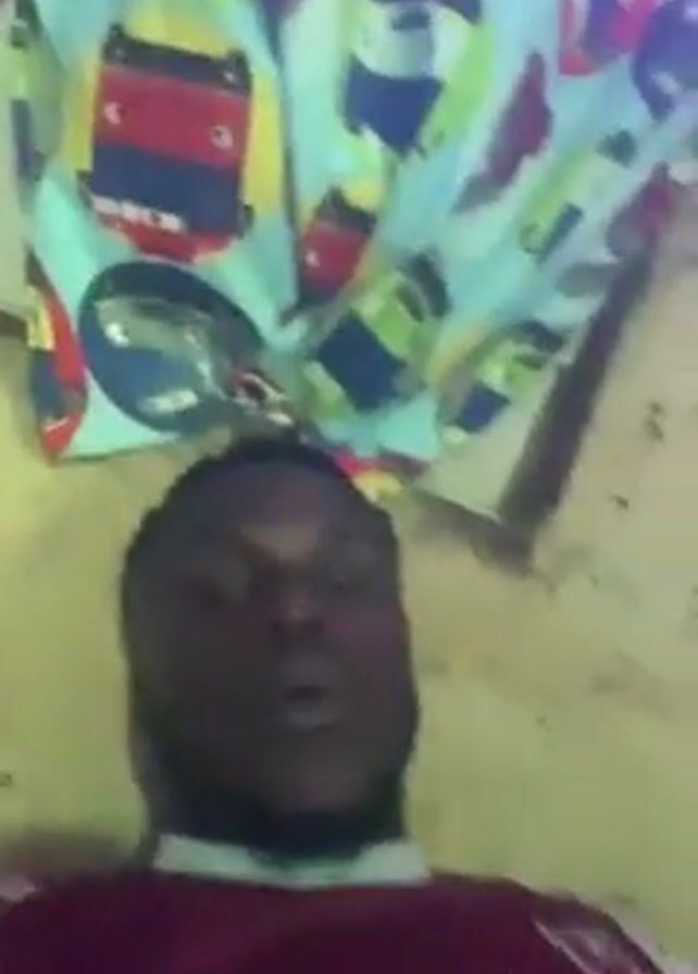 A man is lying down, looking into the camera. He is wearing a maroon shirt with a white Umbro logo. Behind him is a curtain with cartoon cars printed on it. He moves his mouth as if talking but there is no audio. The background appears to be a room with cream-colored walls.