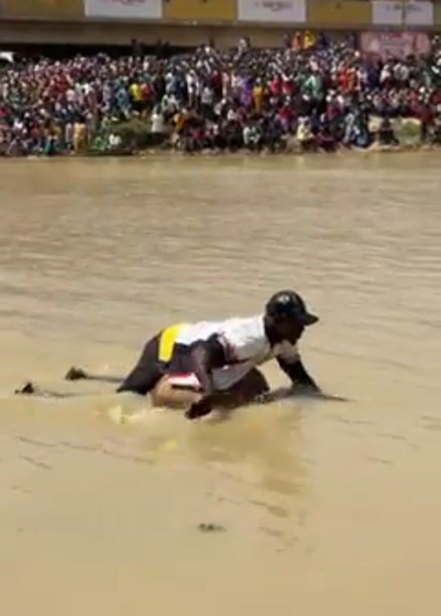 man in a river, seemingly struggling with a large animal, possibly a bull, while a large crowd watches from the riverbank