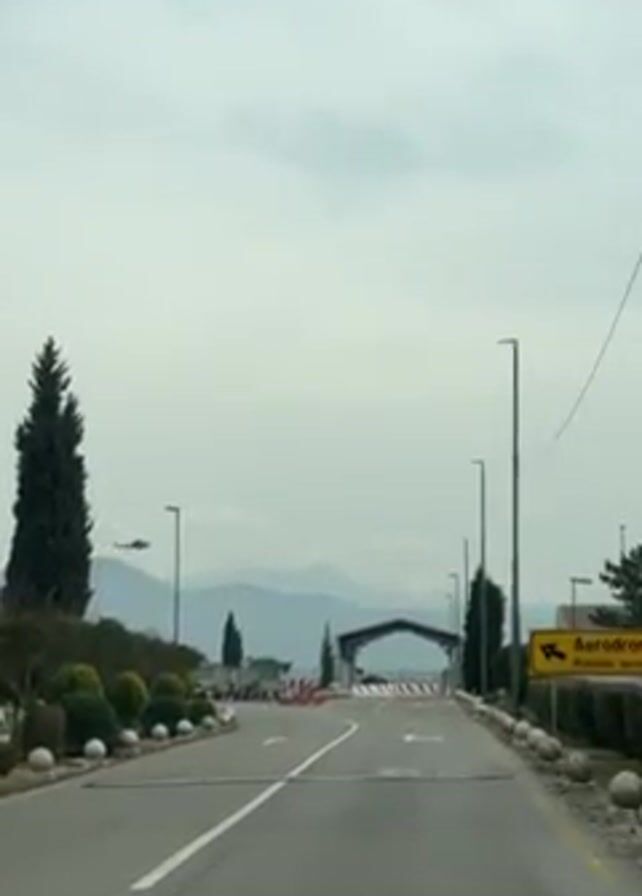 road leading to an airport. The road is paved and has white lines marking the lanes. On either side of the road are trees and round, white stone bollards. Streetlights line the road. A sign on the right directs traffic to the airport terminal. In the distance, there is a gate with red and white striped barriers blocking the road. Beyond the gate, mountains are visible in the background. A helicopter flies over the mountains and gate. The sky is overcast.