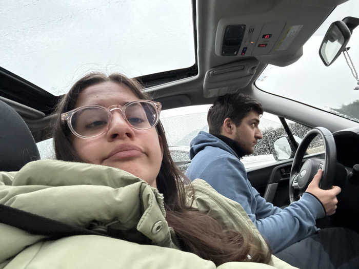 The scene is set inside a vehicle in the city of Mtskheta, Georgia, during rainy weather. In the foreground, a young adult female is positioned in the front passenger seat, looking directly at the camera with a neutral expression. She wears clear-framed glasses and a light green puffer jacket. Behind her and to the right, a young adult male occupies the driver's seat. He has dark hair and light facial hair, wearing a blue hoodie over a dark turtleneck. His right hand is on the steering wheel, and he is looking forward and slightly to the right. The vehicle's interior features an open sunroof with visible raindrops, a grey overhead console with an illuminated red warning light and an SOS button, and a rearview mirror from which a beaded ornament hangs. Raindrops are visible on the front windshield and driver's side window, indicating overcast and wet external conditions.
