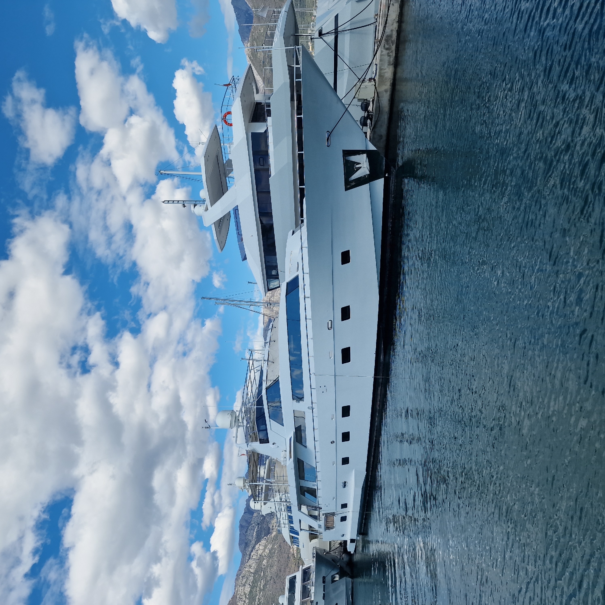 A vertical eye-level shot depicts two large, white yachts moored side-by-side in the city of Bar, Montenegro, against a backdrop of a partially cloudy sky and distant mountains. The yacht closer to the viewer displays a prominent dark insignia on its front. The water surrounding the yachts is a deep blue. The boats are moored to a concrete dock. The sky above is partially obscured by large, puffy white clouds. In the background, faint mountain ridges can be seen.