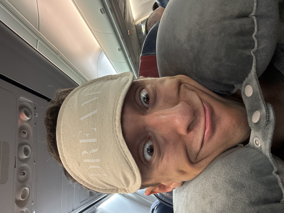 A man wearing a tan sleep mask with "DREAM" printed on it smiles at the camera while on an airplane