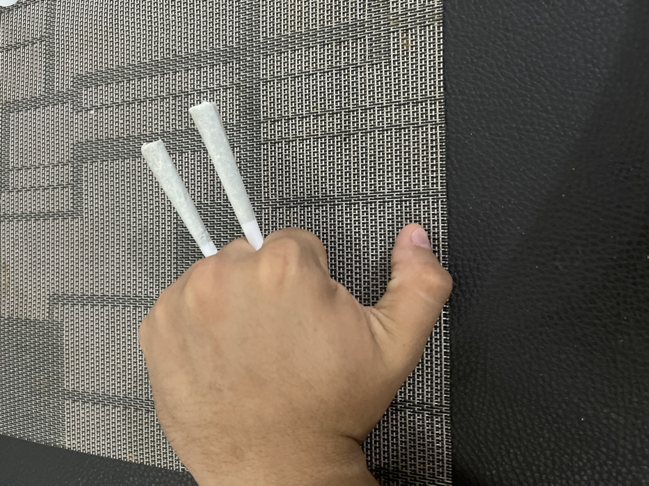 In Komchén, Mexico, a medium-brown skinned right hand is captured from an overhead perspective, positioned in a claw-like stance. Two cylindrical white pre-rolled items, each approximately 10-12 cm in length with visible light green/grey plant material at their ends and white filters, are held protruding from between the knuckles of the index, middle, and ring fingers. The hand's thumb is bent and rests upon the surface. The immediate background consists of a woven placemat featuring a repeating pattern of light brown/beige and darker squares, giving it a grid-like texture. The lower portion of the scene displays a solid black, textured surface, consistent with leather or a similar material, bordering the placemat.