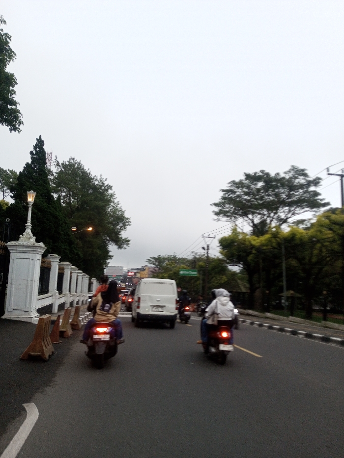 This image depicts an urban street scene on an overcast day, observed from the perspective of a vehicle or motorcycle traveling on the road. The asphalt road surface, dark and wet in areas, features a white curved line marking on the far left. In the immediate foreground, two individuals are riding motorcycles, both viewed from behind. The rider on the left wears a light brown or orange top with dark pants and possibly a dark backpack, operating a motorcycle with an illuminated taillight and a partially visible "AD" license plate. To the right, another rider wears a white jacket or hoodie, operating a motorcycle also displaying an illuminated taillight. To the left of the road, a decorative white fence with multiple ornate pillars and a prominent lamppost stretches alongside the pavement. Several brown traffic cones or barriers are positioned along this fence. Further along the road, traffic appears congested, centered by a white cargo van or utility vehicle also seen from the rear. Beyond the immediate vehicles, numerous other motorcycles and obscured vehicles are visible, indicating traffic flow. The environment includes a dense line of green trees on both sides of the road. Utility poles with overhead wires are present on the right side of the street, where a raised curb with white and black markings separates the road from a grassy area. A green street sign is faintly visible in the mid-distance on the right, but its text is unreadable. The sky above is uniformly light grey and overcast, suggesting a cloudy day. The scene is located in the city of Chagzam_Pam, Bhutan.
