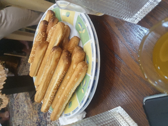 The image displays an indoor scene located in the city of Al-Hama, Syria. The central focus is a stack of approximately fifteen to twenty elongated, light brown baked items, resembling breadsticks or pastries, neatly arranged on a white ceramic plate. The plate features a distinctive rim design with green, yellow, and blue patterned segments. Many of these baked items are visibly topped with white sesame seeds. This plate rests upon at least one additional identical plate. The items are situated on a dark brown wooden table exhibiting a pronounced grain pattern. In the immediate foreground, to the lower left, a portion of a black smartphone is visible. To the lower right, two clear glasses with textured surfaces are present; the foremost glass contains a light amber-colored liquid. The background reveals a patterned rug or carpet with predominant blue and beige hues. Partially visible bare feet are discernible on this rug in the upper left area. Also in the background, portions of individuals are visible: a person wearing light-colored trousers is on the right side, and a segment of a skin-toned limb is in the upper left, behind the table. A dark, possibly wooden, furniture leg and a light-colored, possibly crocheted or lace, textile are also present in the upper left background. No explicit actions or direct interactions between individuals are depicted.