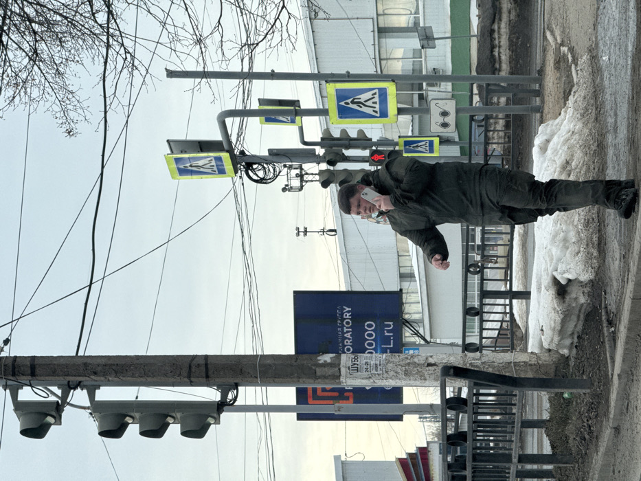 The image displays an urban street intersection in Chaikovsky, Russia, under an overcast sky, with remnants of melting snow on the ground. A male individual, appearing to be in his late 20s or 30s, walks on a concrete sidewalk towards the right of the frame. He is wearing a dark olive-green or dark gray hooded jacket, matching trousers, and dark athletic shoes or boots. He holds a light-colored smartphone to his right ear with his right hand, actively engaged in a phone call, with his left arm slightly bent forward. To the left of the pedestrian is a robust concrete utility pole supporting multiple overhead power lines and two vertically stacked gray traffic lights. Behind this pole, a large blue billboard is partially visible, displaying Cyrillic text that includes "ГЛАВНАЯ ГРУППА" and "ORATORY," along with a smaller paper advertisement reading "ШУБЫ" (Furs). To the right of the concrete pole, a metal pole structure supports several yellow rectangular signs depicting a black pedestrian figure, indicating a crosswalk. This structure also features a pedestrian traffic light displaying a red standing figure and a small white rectangular sign with a pair of black eyeglasses at its base. Patches of dirty, melting snow and exposed soil are present on the sidewalk and alongside a dark metal fence running parallel to the sidewalk on the left. In the background, light-colored industrial or commercial buildings are visible beneath a canopy of bare tree branches.
