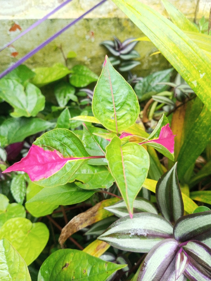 The image presents a detailed, close-up view of various plant foliage in Khammam, India. The primary subject is a plant featuring vibrant green, ovate to lanceolate leaves with distinct pink-red venation. Several of these leaves exhibit striking fuchsia pink coloration, particularly at the tips and along one side of the lamina, indicative of variegation. Adjacent to the lower right, a *Tradescantia zebrina* plant is visible, characterized by its elongated, striped leaves displaying shades of dark green/purple and silvery-green. Surrounding these are other forms of green foliage, some appearing yellower and partially obscured. The upper background reveals a textured, light-colored wall, possibly concrete or stucco, showing areas of minor reddish-brown discoloration and general weathering. A blurry, thin purple object, likely a plant stem or vine, extends diagonally across the upper left quadrant. Small, reflective water droplets are present on several leaf surfaces, suggesting recent precipitation or watering. No human subjects, animals, or direct actions are depicted. The scene is static, focusing exclusively on the botanical elements within an outdoor setting.