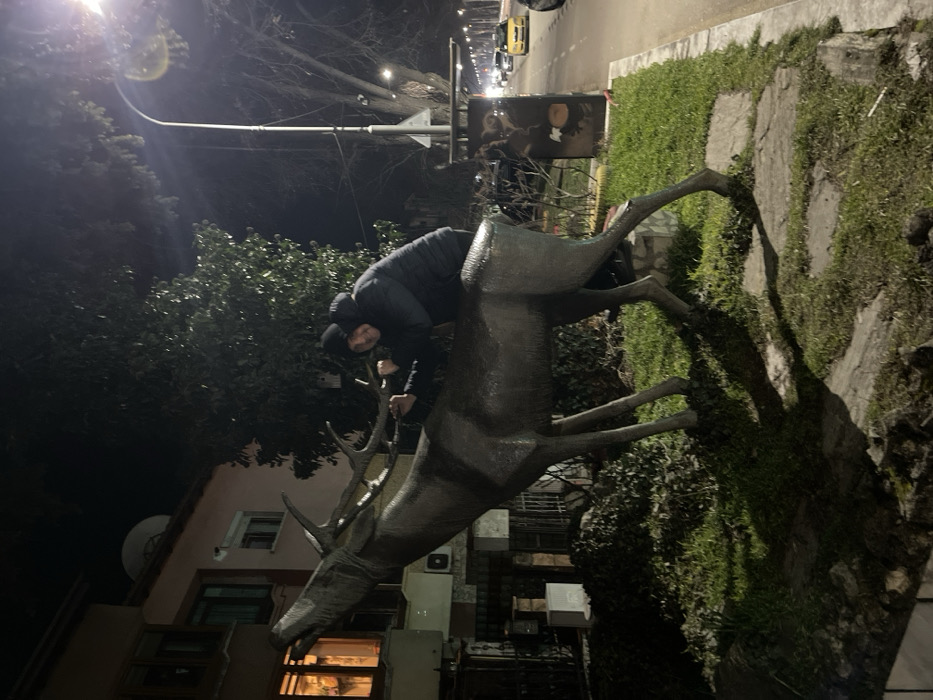 At night in Velingrad, Bulgaria, a male individual is observed straddling a large, dark metallic statue of a stag