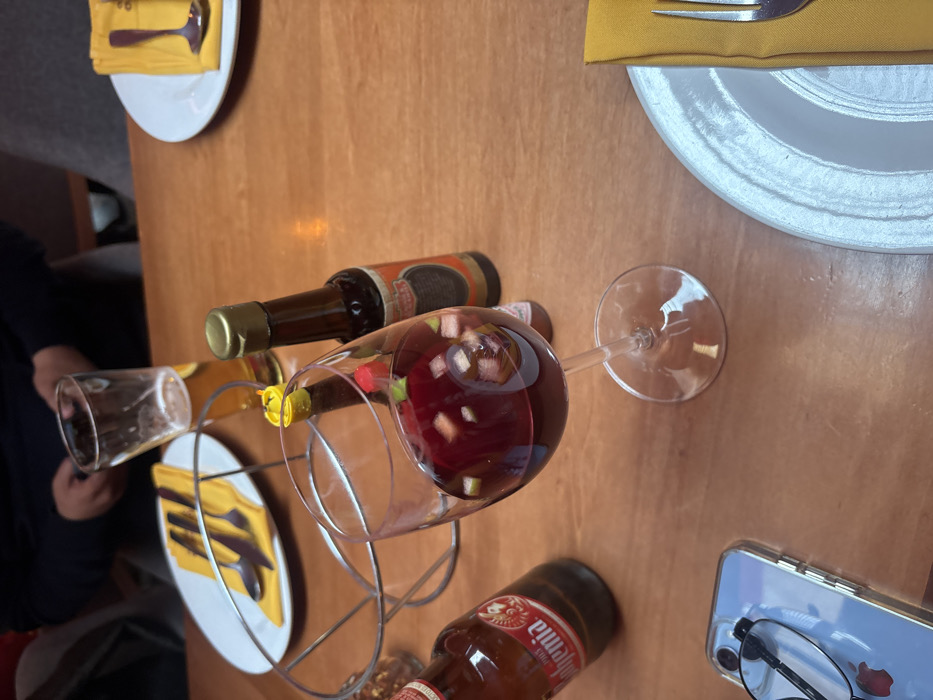 The image displays a restaurant table scene in Puebla, Mexico. The central surface is a light brown wooden tabletop. In the foreground, a stemmed glass holds a dark red beverage containing diced fruit pieces, likely sangria. To its left, a partially consumed "Bohemia" beer bottle is visible. A light-colored smartphone with a clear case and a pair of dark-rimmed glasses rests on the table in the bottom-left corner. Behind the sangria glass, two small, dark glass bottles with yellow caps and orange labels, indicative of condiments, stand upright. A metallic wire caddy is partially visible behind these bottles. In the mid-ground, a white plate supports a yellow napkin containing a fork, knife, and spoon. Adjacent to this, a tall, clear glass holds a light amber liquid. Two individuals are blurred in the background: one figure, wearing a dark garment, is holding the aforementioned beer glass, while the shoulder of another figure, clad in grey, is visible to the right. In the upper-right background, another white plate features a yellow napkin with a single spoon. A final white plate with a yellow napkin and a fork is visible in the bottom-right foreground.