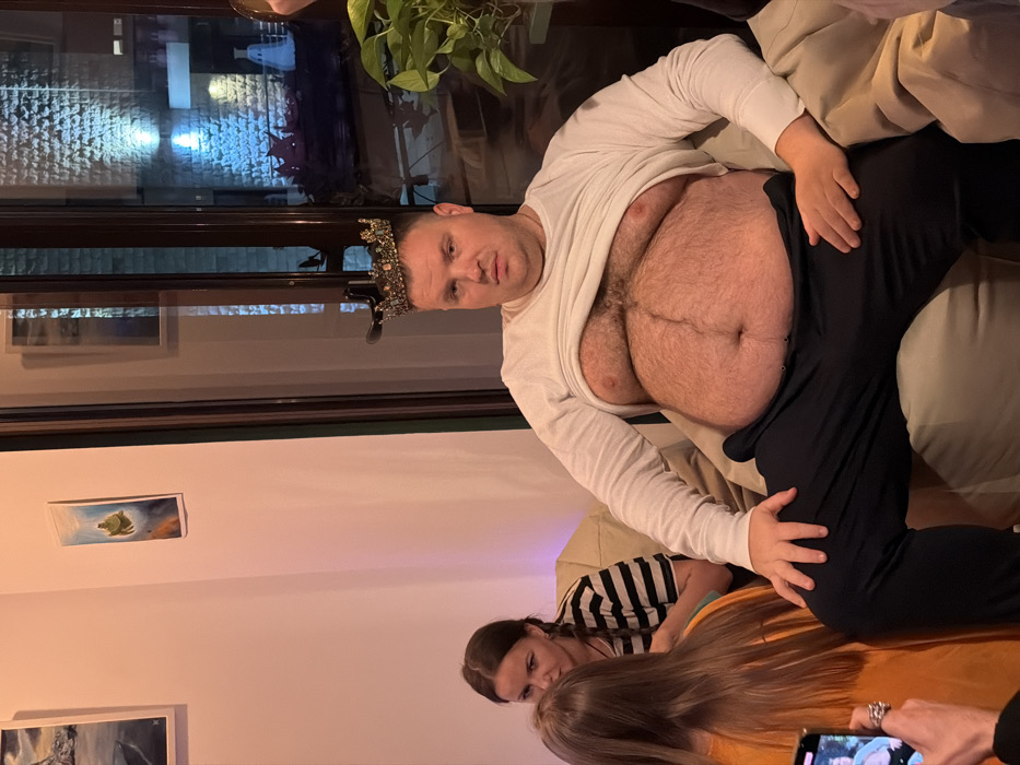 The image portrays an indoor scene in Boreti, Montenegro, featuring multiple individuals and decor. Centrally positioned, an adult male with fair skin, short dark hair, and a visibly hairy abdomen and chest is seated in a light-colored beanbag chair. He wears a white long-sleeved shirt, pulled up to expose his midsection, and dark-colored pants. A dark, ornate crown with metallic and jeweled accents is perched on his head. His expression is neutral as he looks directly forward. To the left foreground, the back of a person with long light brown hair wearing an orange top is visible, holding a smartphone with a distinctive ring on their finger, apparently recording the central male. In the background on the left, an adult female with dark braided hair, wearing a black and white striped shirt, is partially visible, looking towards her left. The room features light-colored walls displaying framed artwork, including a vertical painting of a green, floating figure. A large glass door or window on the right reveals an outdoor night scene, reflecting artificial blue and white lights on an exterior textured wall and a green potted plant in the foreground. The interior lighting is warm, with a subtle purple ambient light visible in the background.