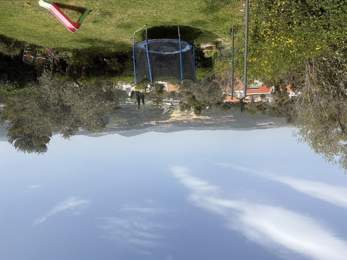 The image displays an outdoor scene in Kfar Vradim, Israel, under a clear blue sky with sparse white clouds. The foreground features a green lawn. Centrally positioned on the lawn is a blue and black trampoline with a safety net. To its right, a small red and green plastic slide rests on the grass. The far-left foreground contains a dense bush with yellow flowers. Metal poles, possibly part of a clothesline or playground structure, are visible toward the left-center. The midground consists of an array of green trees and shrubs, partially obscuring residential rooftops with red tiles. In the background, a sprawling landscape of green, vegetated hills and valleys extends to the horizon. A winding road is discernible through the distant terrain. No individuals are present in the scene.