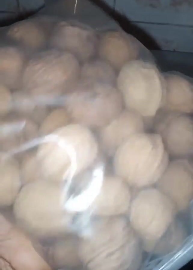 person holding a large plastic bag filled with walnuts in their shells. The walnuts are brown and have a slightly wrinkled surface. The person is holding the bag in front of a white tiled wall. There is a blue plastic basket in the background. The person says, "Have you seen walnuts before? This is how they come. Yes, this is how they come."