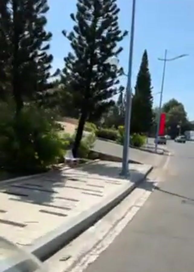 park with a monument in Vietnam. The camera is moving on a sidewalk near a road with sparse traffic. There are tall pine trees and streetlights along the road. The monument is a tall, white pillar with Vietnamese text on it, situated at the top of a terraced hill. The surrounding area is landscaped with flowers and decorative elements. The sky is clear and blue.