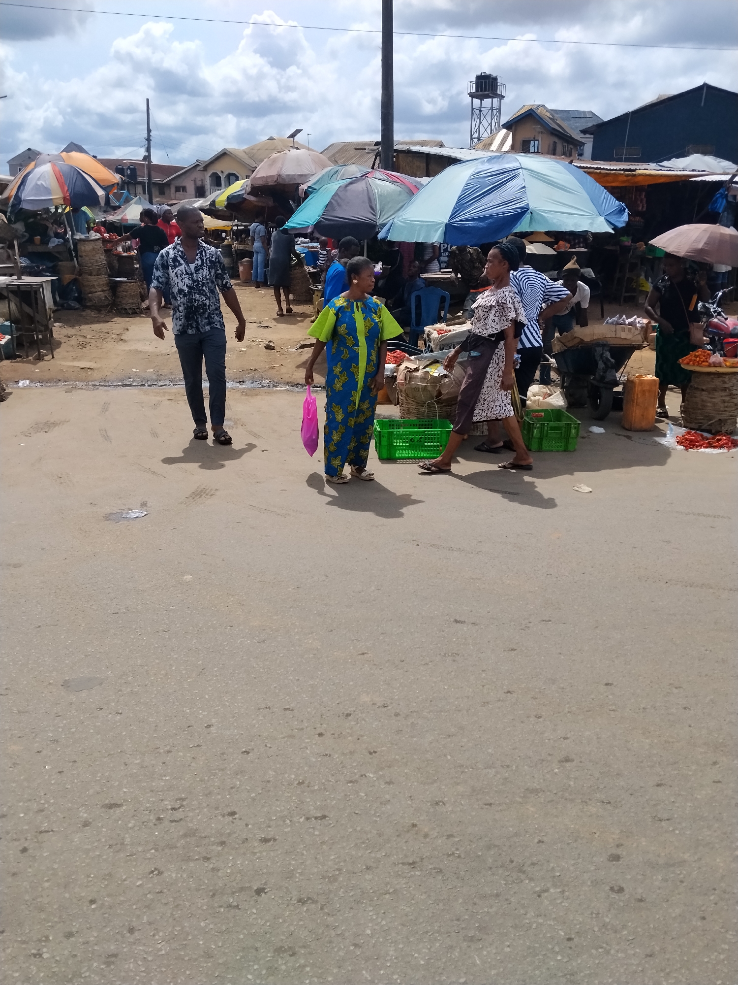 The image depicts a busy market scene in Ura Nta Umuarandu, Nigeria. In the foreground, there is a paved street. A man in a patterned shirt and jeans is walking on the street, towards the left of the frame. A person wearing a blue and yellow dress with a pink plastic bag walks nearby. To the right, a woman in a printed dress walks, seemingly carrying items. Green crates are on the ground near her. Behind them, a crowd of people are gathered around market stalls, many covered by umbrellas of various colors and patterns. Baskets of goods and other items are visible on the stalls. In the background, buildings of various heights and construction styles can be seen. A water tower stands tall above the buildings. The sky is partly cloudy.