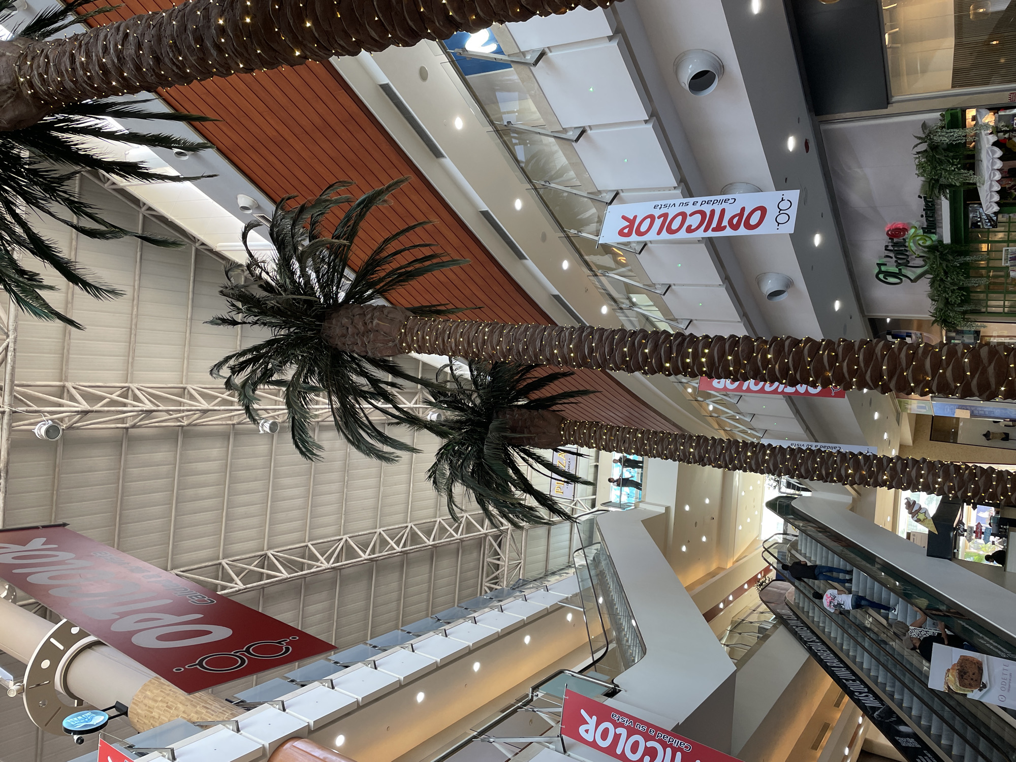interior of a shopping mall in Porlamar, Venezuela. Several artificial palm trees adorned with lights are suspended from the ceiling. Banners for "OPTICOLOR" are visible in red and white. An escalator is in operation, with several individuals riding it. The architecture of the mall includes a white metal frame ceiling, white walls and brown paneling. There is a variety of store signage and branding visible throughout the scene.