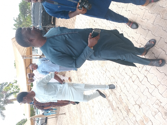 four men standing in a paved area in front of a large white tent. The men are all dressed in traditional African clothing. The man in the foreground is wearing a blue tunic and black sandals. He is holding a cell phone in his right hand. The man behind him is wearing a light blue tunic and black sandals. He is looking at the camera. The man behind him is wearing a light blue tunic and black shoes. He is looking at the camera. The man behind him is wearing a white tunic and black shoes. He is looking at the camera. The background shows other people, a white tent, trees, and a black car. The location is Kaduna Junction, Nigeria. The coordinates are 10.481 latitude and 7.428 longitude.