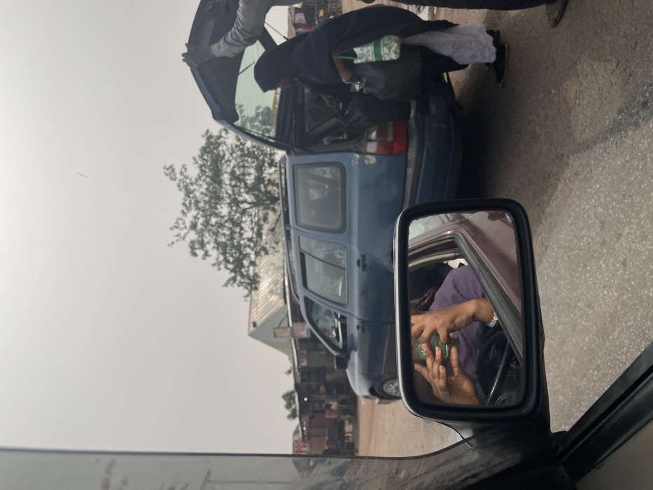 The image depicts a street scene in Kwali, Nigeria, captured from the interior of a stationary vehicle looking out the passenger side