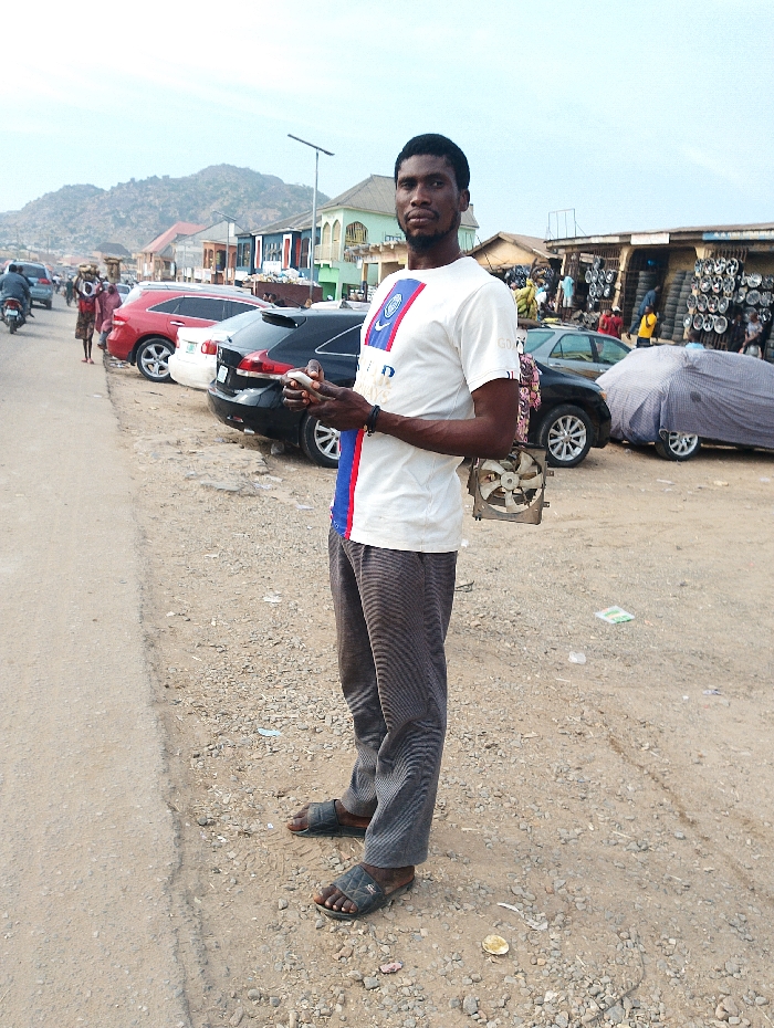 A man stands on a dirt road, wearing a white t-shirt with red and blue stripes, brown pants, and black sandals. He holds a small object in his hands and a mechanical fan is strapped to his back. Cars are parked on the side of the road behind him. Shops selling car parts are visible further back. Mountains can be seen in the distance under a slightly overcast sky.
