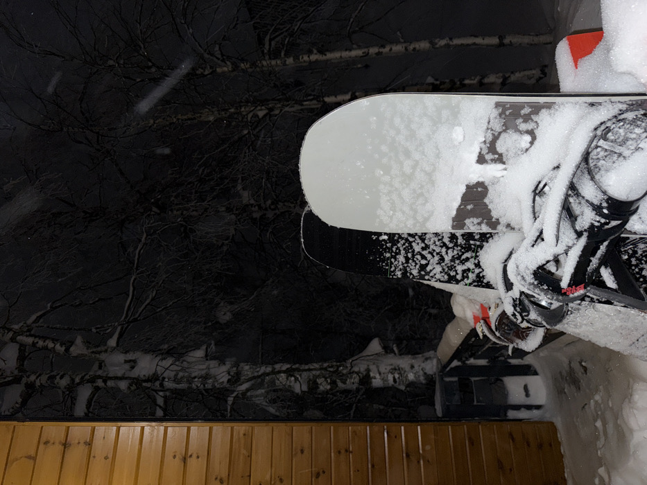 A snowboard, covered in fresh snow, dominates the scene. The boot bindings are visible, also coated in snow. In the background, bare tree branches are silhouetted against a dark, perhaps nighttime sky. A wooden panel is seen at the bottom of the frame, suggesting a deck or balcony. The image captures a moment of winter, likely after a snowfall, with the snowboard ready for action.