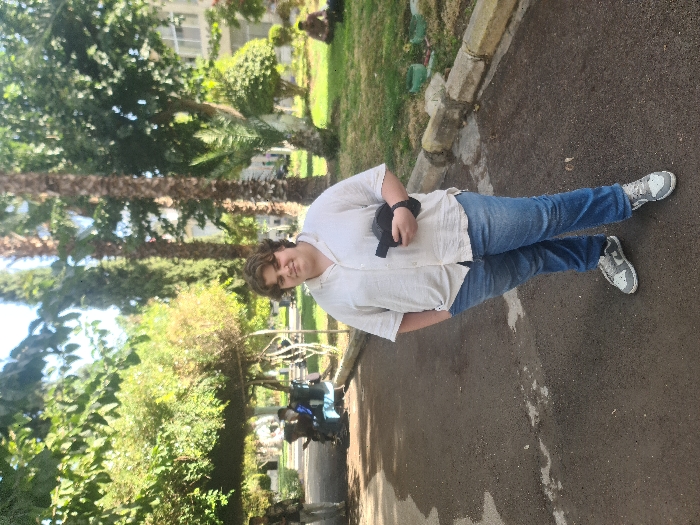 This image depicts an outdoor scene in Rukn ad-Din Municipality, Syria, under clear daylight conditions. A single individual, appearing young with light brown, wavy hair, stands centrally in the foreground. They wear a light-colored, short-sleeved button-up shirt, blue jeans, and grey and white athletic shoes. Their right hand holds a black fanny pack across the torso, while their left hand is placed in a jeans pocket. The individual stands on a dark paved surface exhibiting minor discoloration and moisture patches, bordered by a concrete curb on the right. The background features a park-like environment with extensive green foliage, numerous trees including tall palm-like structures, and grassy areas. Several additional individuals are present in the midground and background: two are partially visible on the left, one seated, and another figure is seated on the grass on the far right. A building with visible windows is present in the distant background.