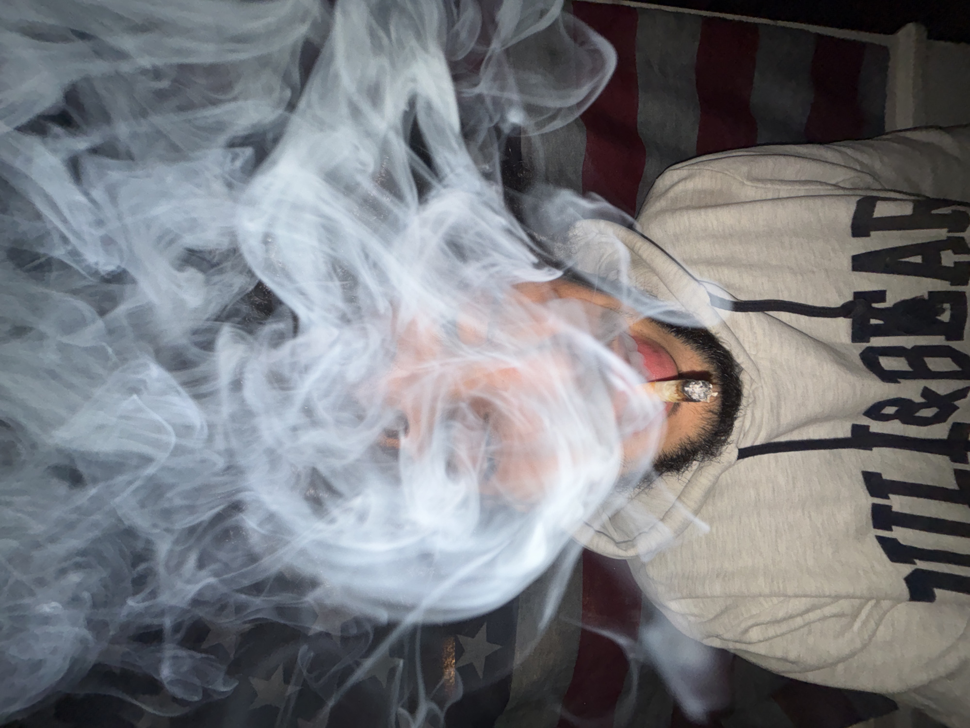 A person is lying on a bed and smoking