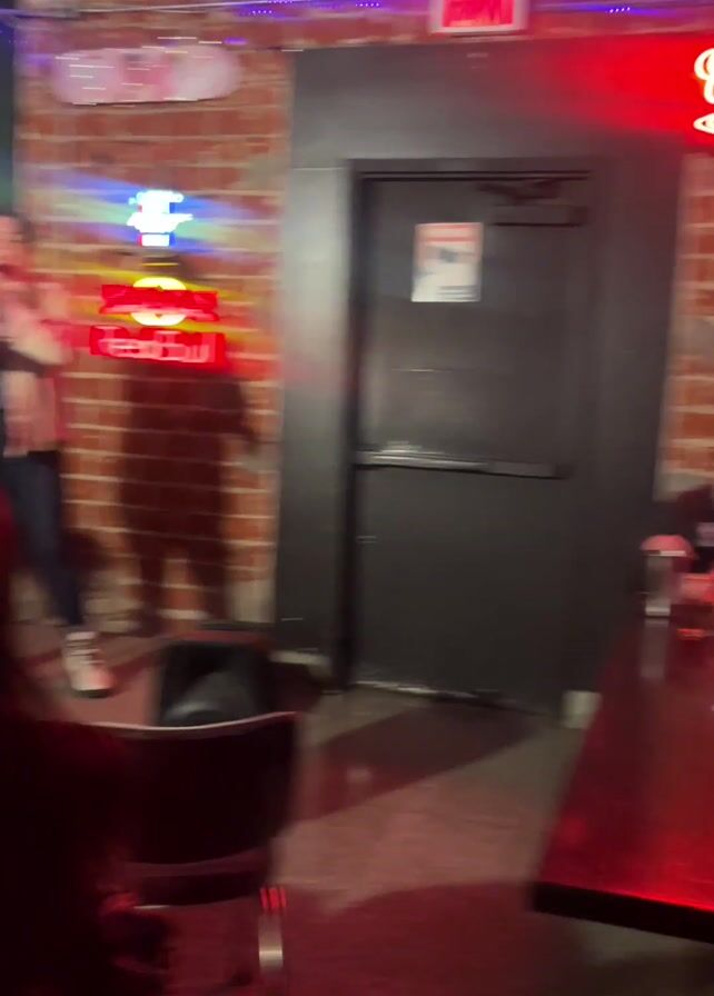 A woman is on stage at a bar, possibly performing comedy. There are a few people in the audience. The background of the stage features a brick wall, a Red Bull sign, and a framed print of a man. The camera moves to the right showing a table with drinks and a man sitting at the table. The camera then pans upwards toward the ceiling. The bar features a brick wall, red lighting, and a neon sign that reads "Celebrity." The video ends with the camera pointed toward beer taps and a blurry view of the bar area.