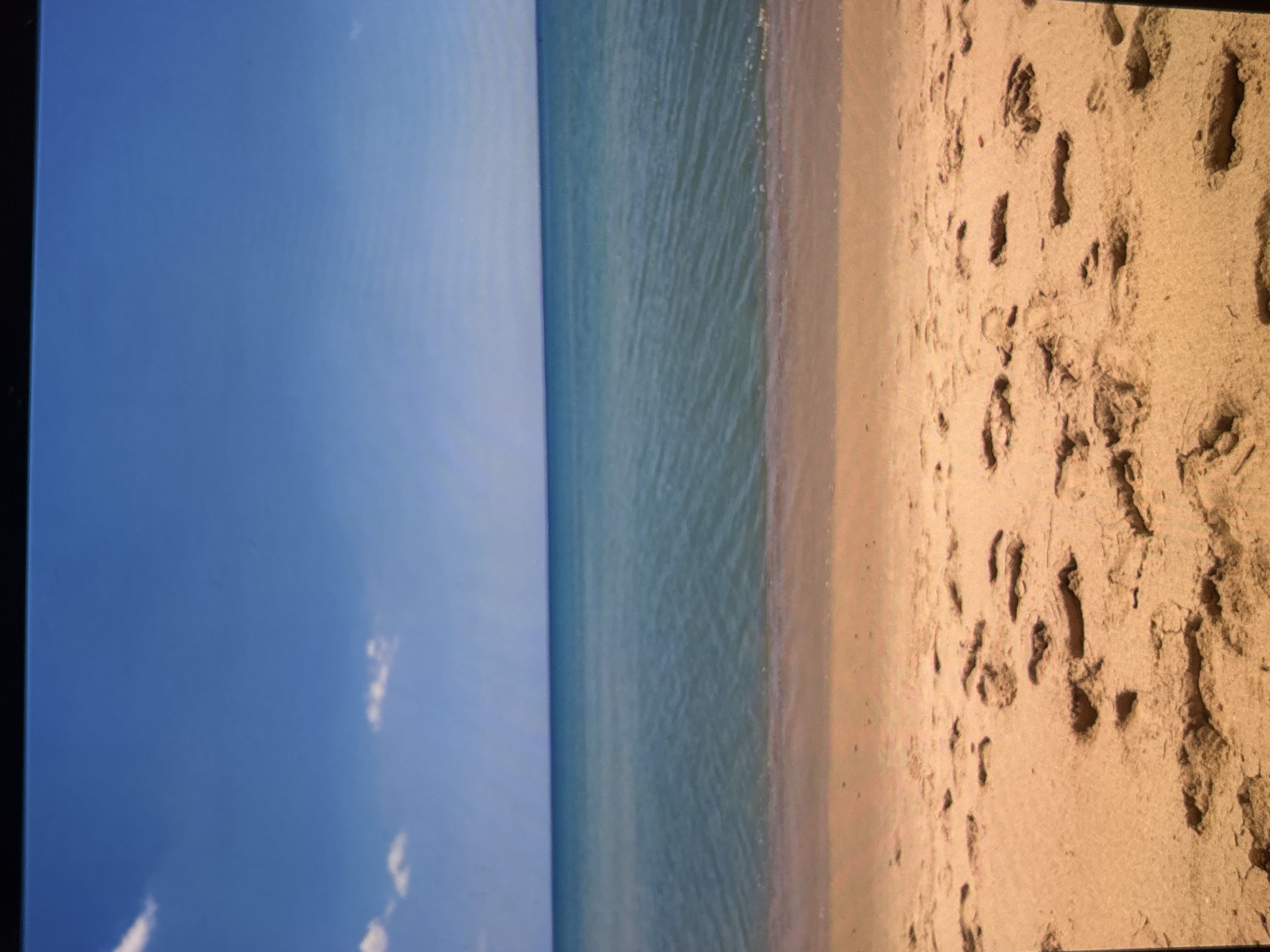 A photograph displays a sky with a few clouds, a body of water, and a sandy beach covered with footprints