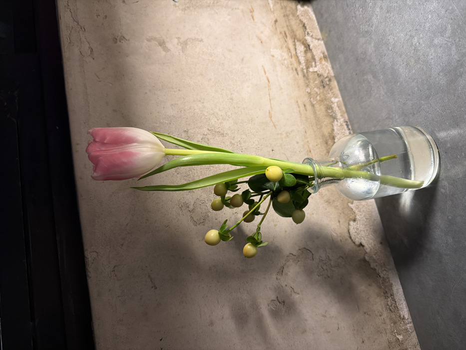 - "A single pink tulip rests in a clear glass bottle alongside sprigs of green foliage with clustered yellow berries" by FM-oB3Mx2, licensed under CC BY 4.0