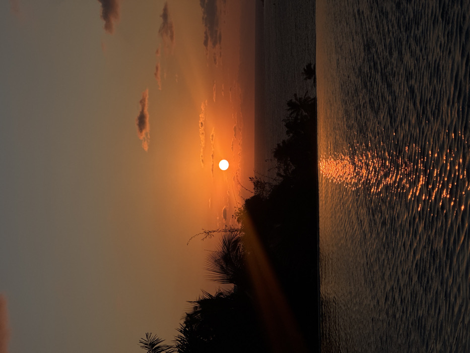 A vertical shot of a sunset over water. The sun, a bright orange orb, hangs in the sky amidst soft, illuminated clouds. Silhouetted foliage stretches along the horizon line, separating the warm sky from the dark water. The water surface reflects the sunlight, creating a shimmering effect. The overall tone of the image is warm and peaceful, evoking a sense of tranquility.