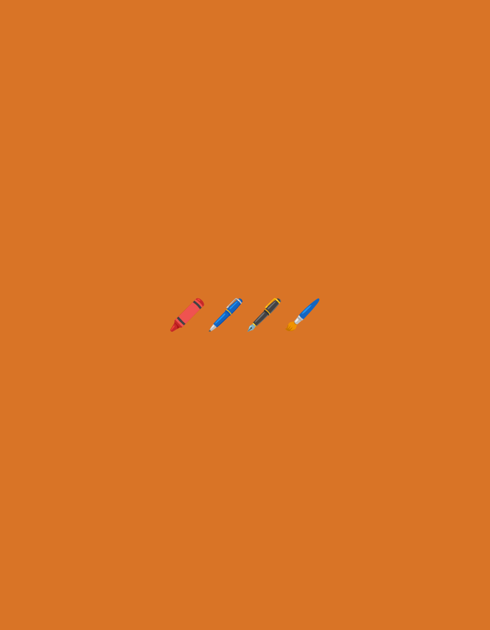 The image displays a uniform, solid orange background. Arranged horizontally in the lower-middle portion of the frame are four stylized art and writing instruments. From left to right, these include a red crayon, a blue pen, a black and gold fountain pen, and a blue paintbrush with a light brown brush tip. No individuals, discernible actions, or interactions are depicted. The environment is abstract, consisting solely of the plain orange surface. There are no visual elements within the image to indicate a specific geographic location, including within the city of Netanya, Israel.