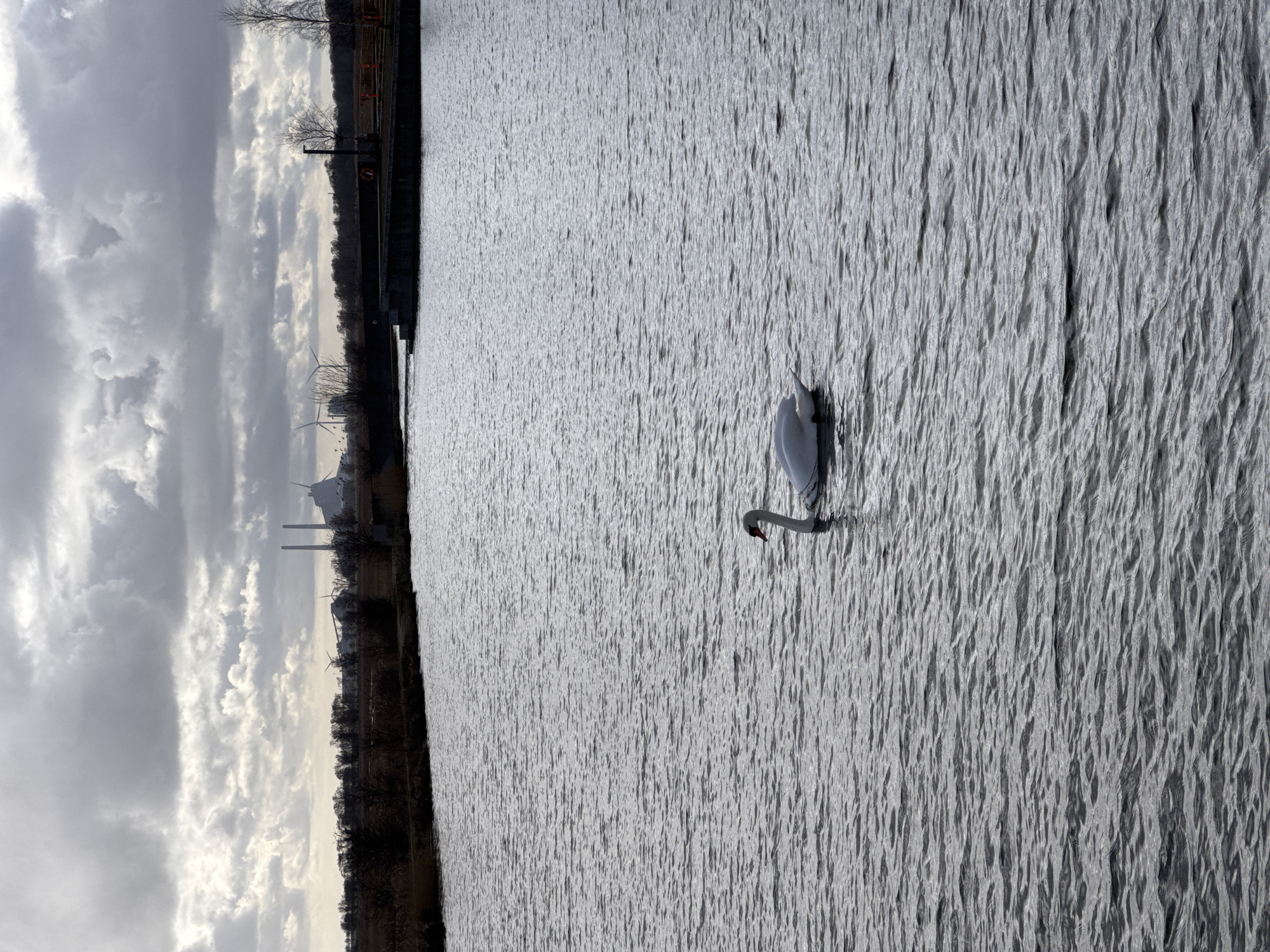 body of water, likely a canal, in Copenhagen, Denmark, with a single white swan swimming in it. The water's surface is textured with ripples, reflecting the overcast sky above. A dark shoreline runs along the left side of the frame, dotted with trees and industrial structures in the background, including wind turbines. The sky is filled with heavy, grey clouds.
