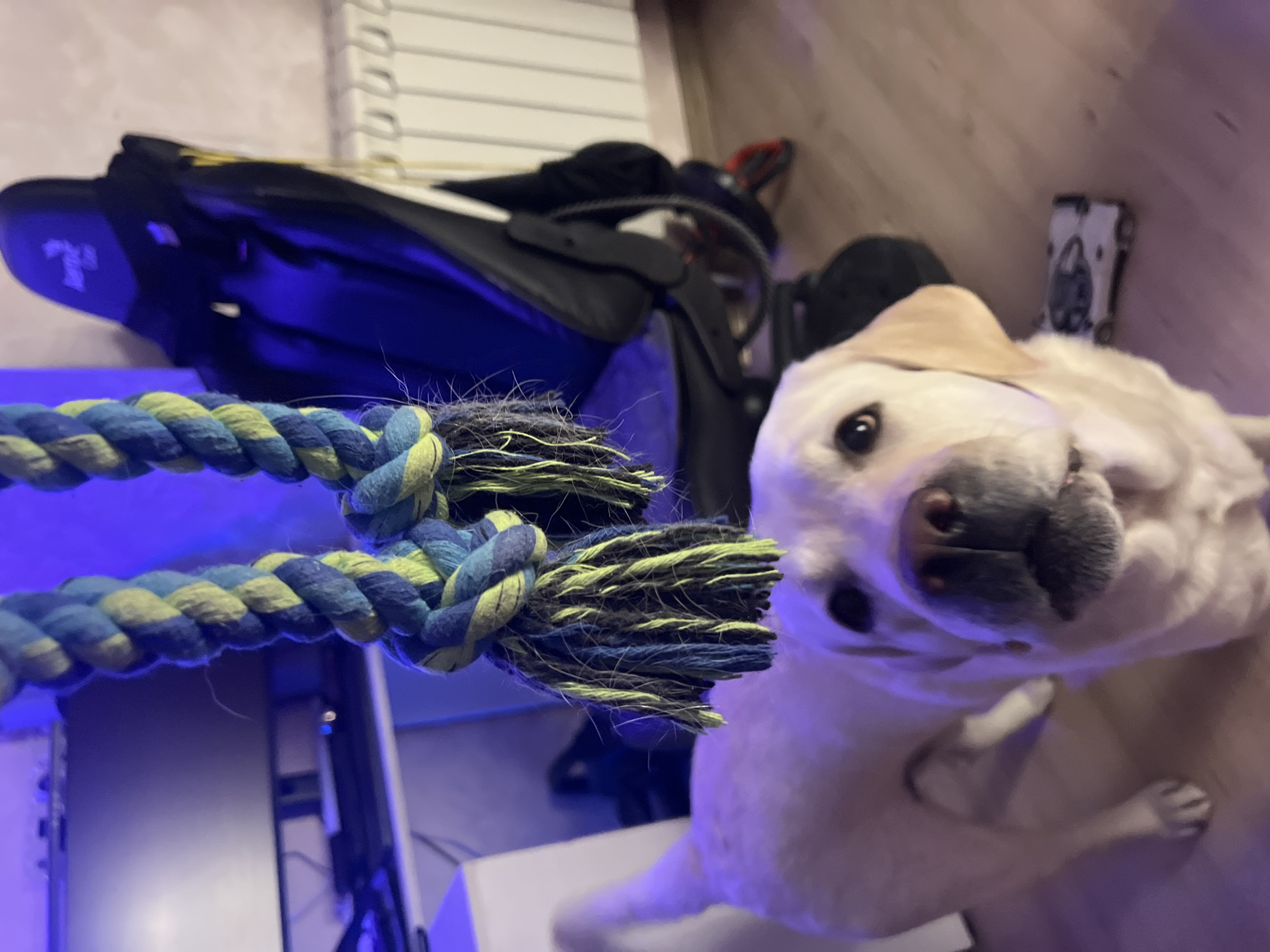 The scene is an interior room located in Mytishchi, Russia, illuminated by predominant blue artificial lighting. In the foreground, a blue and yellow braided rope toy with frayed ends is suspended. Centered in the midground, a light-colored Labrador Retriever dog stands on a light wooden floor, looking upwards towards the rope toy with its muzzle slightly open. To the background left, a white desk holds a dark computer monitor and other electronic devices. To the background right, a black gaming chair with visible "AeroCool" branding on its headrest and red accents on its wheels is positioned. Adjacent to the chair, a white wall-mounted radiator is visible against a light-colored wall. A small white toy vehicle is present on the floor to the right of the dog.